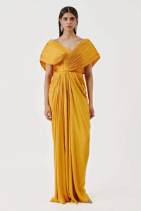 Featuring the Golden Glow Gown from Aroka's Signature Collection, a draped gown crafted in lustrous modal satin with lightweight voile lining. Showcasing intricately pleated shoulders and a sculpted bodice, the pleating at the waist flows into a fluid, floor-length silhouette. Rendered in a rich mustard hue, this gown is bold, refined, and timeless.