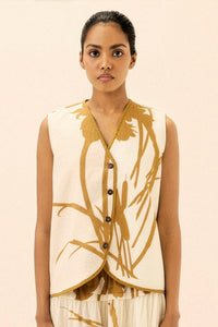 A mul coordinated set featuring a cut-sleeve V-neck top paired with a gathered skirt, offering fine elegance and a graceful drape