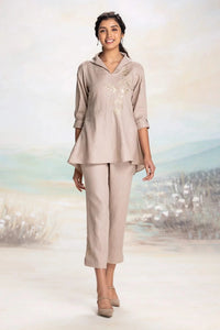A high-collared neck dress with intriguing style lines, beautifully accented with gold embroidery. The 3/4 sleeves feature box pleats at the hem, with a graceful dragonfly embroidery adding a whimsical touch. Crafted from luxurious linen, the dress is adorned with delicate laser-cut golden leaves, intricately appliquéd to create a captivating, dimensional effect. Each leaf is meticulously embroidered with fine silk threads, while a vibrant bouquet of flowers hangs delicately, adding balance and depth to this exquisite design.