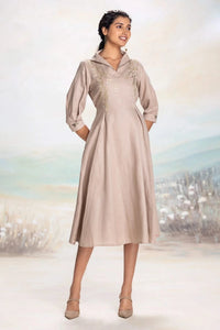 A high-collared, 3/4 sleeve dress with box pleats at the hem and a whimsical dragonfly embroidery. The princess-cut fit-and-flare design is beautifully enhanced with geodes sewn along the seams, highlighting the dress's elegant flare. Crafted from luxurious linen, the dress is adorned with delicate laser-cut golden leaves, intricately appliquéd to create a captivating, dimensional effect. Each leaf is meticulously embroidered with fine silk threads, while a vibrant bouquet of flowers adds balance and depth, completing the stunning and intricate design.