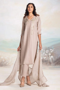 A straight kurta with a V mandarin collar, 3/4 sleeves, and box pleats at the hem, featuring delicate dragonfly embroidery. The kurta is paired with a beautiful linen dupatta with ruffled edges and matching pants, creating a harmonious and elegant ensemble. Crafted from luxurious linen, the piece is adorned with delicate laser-cut golden leaves, intricately appliquéd to create a captivating, dimensional effect. Each leaf is meticulously embroidered with fine silk threads, while a vibrant bouquet of flowers adds balance and depth, making this design both enchanting and refined.