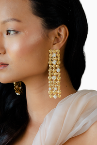 Like the bright shinning light of the moon, we have made Noor for your ears. These one of a kind danglers are made by putting together little, circular pieces handcrafted in brass along with our signature hand embellished beads. With these, we hope to add a little more noor to your Noor.