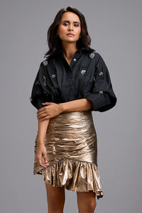 Featuring the Golden Orbit Oversized Shirt Set by Deepika Arora's Eclipse Collection. A black embellished oversized shirt is paired with a metallic gold ruched mini skirt featuring an asymmetric ruffle hem—balancing bold texture with refined elegance.