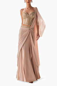 Featuring Golden Radiant Shimmer Corset Saree by Mandira Wirk. This draped saree exudes glamour with its metallic shimmer chiffon fabric. Intricate embroidery detailing on the corset elevates the elegance, while an embroidered belt adds a touch of opulence, making it perfect for any special occasion.