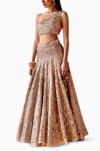 The Lehenga is adorned with intricate Mirrorwork and Golden embellishments paired with an One-Shoulder Blouse in asymmetrical design, completed with Mirrorwork detailing.