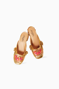 Featuring Goota Love Mule Heels by 5 Elements by Radhika Gupta. These stunning gold heels adorned with intricate Goota work in vibrant colors and peacock ghungroo embellishment guarantee love at first sight! With double cushioning for comfort, they're the perfect blend of style and comfort for any occasion.