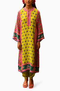 Gulaabo’ an unsung mystery, a secret bloomed in the baghs. Inspired by the morning dew of spring, a fresh whisper of greens, and the blushing beauty of gulaabi gajra. A celebration of prints and patterns, this Gopi Kurta Set is exquisitely crafted in silk fabric making it an all-season wear.