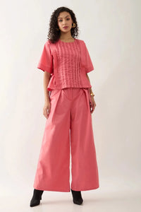 Featuring a vertical print with delicate running stitch details, the Gordan Salmon Set blends texture and subtlety. Short sleeves with stitched hems, a back button closure, and adjustable side gathers create a refined, customizable fit. Relaxed yet structured, this versatile set is an essential addition to any wardrobe.