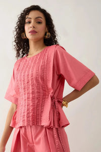 Featuring a vertical print with running stitch accents, the Gordan Salmon Shirt blends minimalist design and thoughtful details. Short sleeves with stitched hems and a back button closure add clean finishes, while gathered sides with adjustable straps provide a tailored fit, making it ideal for both casual and polished looks.
