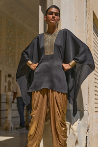 Drapey kaftan top with exaggerated movement in a satin crape fabric. Placed hand applied gota embroidery around the neck. Keyhole with loop and gold button closure in the back.