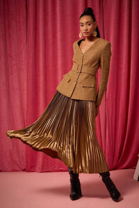 This stunning gold tweed jacket features a flattering V-neckline and a button closure at the front, creating a classic yet modern silhouette. With full sleeves and a coordinating belt to cinch the waist, it adds a touch of sophistication to any outfit. Paired with a luxurious satin pleated skirt that flows elegantly, this ensemble is perfect for both professional settings and glamorous events.