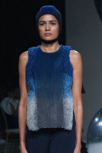Featuring the Gradient Abyss Top, a sleeveless fitted piece with hand-embroidered front showcasing signature loop embroidery and bold oversized loops. Its ombré finish transitions from blue to silver, complemented by a cropped back with additional hand embroidery. A concealed back zipper ensures a seamless finish.