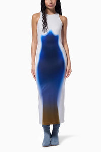 This trompe l'oeil print bodycon dress is designed to accentuate the female silhouette with its captivating gradient print. Crafted from soft and stretchy fabric, it offers a comfortable yet figure-hugging fit. The elegant maxi length and sleeveless design add a touch of sophistication, while the vibrant blue color creates a striking, modern look.