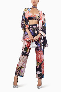 Make a striking statement with Grance Black Multicolored cape and bustier set, perfectly paired with pants and a chic tie-up belt. Crafted from exquisite Chanderi fabric, this 3-piece ensemble exudes sophistication and modern style.