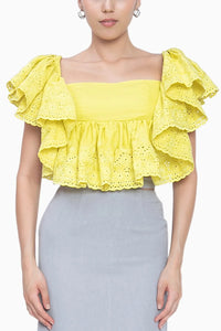 Featuring a crop-length top from the Sorrento Collection, designed with delicate frilled sleeves and a side concealed zipper. This embroidered slim-fit piece offers a square neckline and sleeveless style, blending soft, feminine charm with an easy, flattering silhouette.