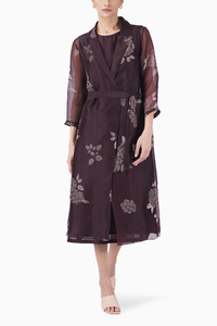 Introducing a stunning grape rose print organza jacket paired with a solid dress in silk chanderi. This elegant ensemble exudes sophistication and charm, perfect for any special occasion.