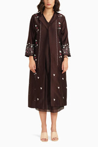 This Grape V-Neck Dress in Silk Chanderi exudes effortless elegance with its flowing silhouette and rich color. Paired with a Printed Silk Chanderi Jacket featuring intricate embroidery, this ensemble offers a perfect blend of style and sophistication. Ideal for both formal and festive occasions, it promises a luxurious, timeless look.