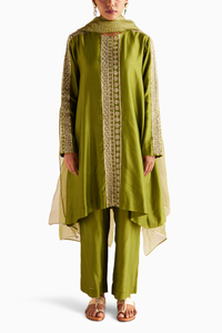 Fabric- Kurta and Pant- Chanderi Silk, Dupatta- Organza Silk Color- Green Embroidery- Zardozi Fit- Relaxed Components- 3 Product Code- SVEESHAEA1203