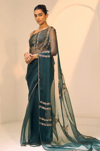 Featuring Green Anya Sari by Sarang Kaur from Seerat Collection. This vibrant green organza silk saree comes with an unstitched satin blouse piece. This elegant ensemble combines luxurious fabric and versatile styling options for a sophisticated and striking look.