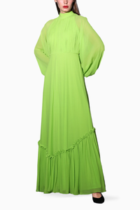 Featuring the Green Backless Tie Halter Neck Gown by Swatee Singh. Revel in leaf green Georgette, showcasing a backless tie halter neck, frilled hem, and full pouf sleeves. This fitted gown is an exquisite blend of allure and sophistication.