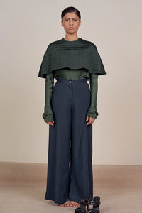 A bold pairing of textures and silhouettes, the forest green vegan silk cape top features handmade repurposed cord overlay with exaggerated long fitted sleeves and zippered openings. It is paired with blue high-waisted flared trousers that offer a relaxed fit, side cutout pockets, and front seam detailing.