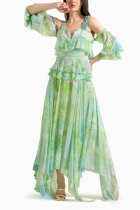 Elevate your style with our Green Chiffon Drop Shoulder Dress. The raw crystal detailing enhances the charm of this elegant dress, perfect for a standout look.