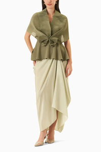 Exude elegance with Ritika Arya Jain's Green Love Top with Drape Skirt. This two-piece coord set, crafted from crepe and satin, offers a true-to-size fit in a vibrant green hue, combining a chic love top with a flowing drape skirt for a refined, sophisticated look.