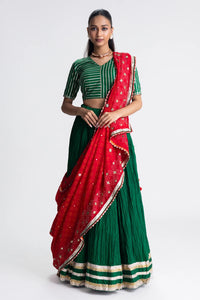 This is green crush skirt with gota lampi borders. It comes clubbed with a red Bandhani on silk dupatta that comes embellished with folded gota hand embroidered work. The blouse is green silk with gota lampi highlights.