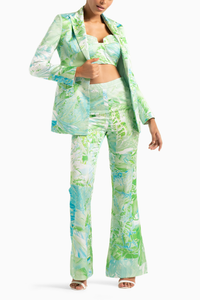 The green raw crystal pant satin suit is a striking and luxurious ensemble that effortlessly combines sophistication with a touch of glamour. The lustrous satin fabric drapes gracefully, while the raw crystal embellishments add a subtle sparkle and texture, making it an ideal choice for a special occasion. The suit features a stylish and contemporary design, complete with a matching bustier top that enhances the overall appeal. This outfit is a statement piece, perfect for those who wish to make a fashionable and elegant impression at any formal event.