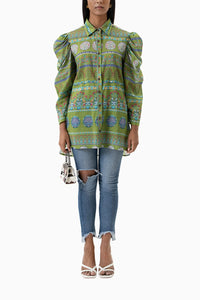 Featuring a fresh green defne shirt with cowl sleeves having monogram buttons.