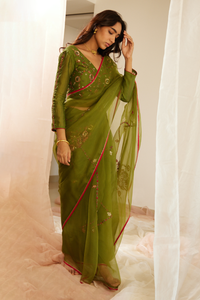 Featuring Green Dhuleti Saree With Blouse by Sarang Kaur from Gulaal Collection. This exquisite saree in lush green is made by organza silk, accompanied by a Chanderi silk blouse piece. Perfect for those who cherish traditional elegance with a modern flair, ideal for festive celebrations.
