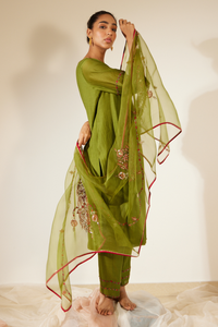 Featuring Green Dhuleti Stole by Sarang Kaur from Gulaal Collection. Crafted by luxurious organza silk, this stole in a serene green hue captures the essence of festive Gulaal. Perfect for adding a touch of elegance to any ensemble, blending tradition with modern style.