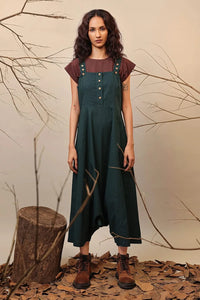 Strap dungarees with adjustable buttons on the straps. Made in handspun cotton comes with side pocket. Team it up with any contrast crop top from the collection to complete the look.