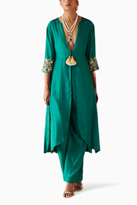 Featuring a silk emerald green hand-embroidered jacket style kurta with pants.