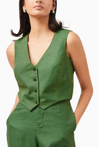 Featuring Evelyn Vest by Contemponari. Boasting of a solid suit style V-neck, this green vest is crafted from Linen fabric and designed keeping in mind contemporary styling. The silhouette and the buttoned front reflects a harmonious blend of modern aesthetics and classic sophistication.