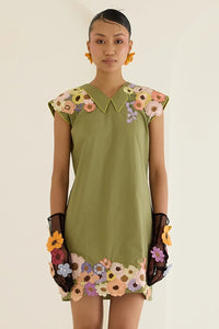 Featuring a Chelsea collar and dramatic mega sleeves, the Green Floral Dress is a short design with floral patches on the shoulders and hem. Yellow piping adds a vibrant contrast, giving this dress a bold and elegant appeal.