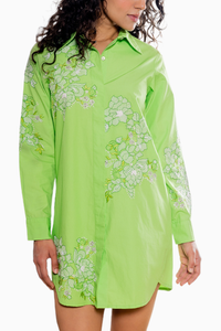 Featuring the Green Floral Embroidered Shirt Dress by Kukoon Label. Made from Egyptian Cotton in a vibrant fluorescent green, it offers a comfortable fit and exquisite hand embroidery with floral motifs. This dress is a single component, blending bold color with delicate craftsmanship for a standout look.