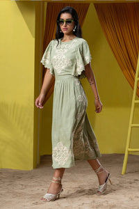 Green Flutter Sleeves Embroidered Midi Dress