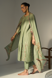 Featuring Green Husna Dupatta by Sarang Kaur by Mansa Collection. Made by exquisite Chanderi silk, this green dupatta enhances any outfit with its delicate texture and graceful drape, embodying elegance and timeless charm for special occasions.