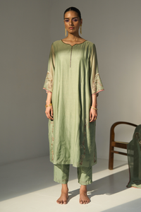 Featuring Green Husna Kurta Set by Sarang Kaur by Mansa Collection. Crafted by luxurious Chanderi silk, this set showcases a vibrant green kurta and matching pants, combining traditional elegance with modern sophistication for a timeless and graceful ensemble.
