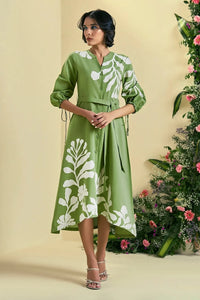 Crafted in a graceful silhouette, this A-line green dress features intricate embroidery and luxurious Chanderi silk appliqué work for a refined touch. Accented with tassels, a drawstring, and a separate belt, it blends comfort, ease, and elegance into a chic summer essential.