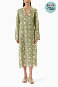 The Kashmir Dress comes in a block printed fabric. It features an oversized fit, V- neckline, wide sleeves falling below the elbow and side vents at the hem.
