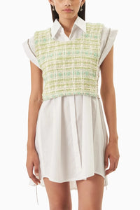 This green knit bib brings a cozy yet contemporary edge to any outfit. Crafted from soft knit fabric, it features playful hanging strings that add movement and texture, making it a versatile layering piece with a touch of creative flair.