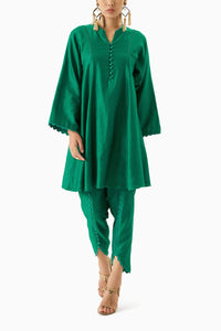 This dark green kurta set makes a great option for a festive occasion. Crafted in chanderi fabric is this short flared kurta paired with matching tulip pants. Scalloped detail at the sleeve cuff and pants overlapping hemline gives effortlessly blending look. You can style it with a pair of strappy heels and a clutch.