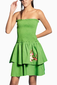 Featuring Green Layered Short Dress by Alan by Vani from Sky is High Collection. An exquisite smocky short dress adorned with intricate embroidery and layered details, perfect for a stylish yet effortless look.