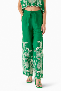 The Ma rlyn Pa nts, cra fted in a soft linen blend. The pa nts fea ture a bea utiful tropica l embroidery in ecru, but wha t ma kes this embroidery unique is Miri's cut work by ha nd. Pa ir it with the Ma rlyn summer ja cket or short shrug !