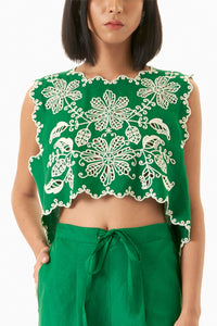 The Ma rlyn Short Shrug, cra fted in soft linen blend. This summer shrug fea tures tropica l embroidery in ecru with bea utiful cut work by ha nd. Wha t ma kes this shrug so versa tile is tha t it ca n be worn both front a nd ba ckwa rds. To complete the look, pa ir it with the Ma rlyn pa nts!