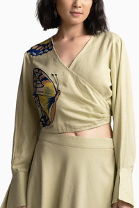 Elevate your style with our wrap-around blouse, adorned with vibrant butterfly embroidery that adds a touch of enchantment. The overlap effect at the front creates a flattering, dynamic silhouette, while the broad cuffs with a slit offer a sophisticated edge. Complete the look with the option to tie a knot at the back or side, allowing you to customize your ensemble and make a bold fashion statement.