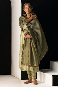 Featuring the Green Nazakat Suit, a hand-embroidered, relaxed-fit ensemble designed for effortless elegance. Tailored in satin silk for the kurta, lycra for the churidar, and paired with a tissue silk dupatta included in the set, this look blends comfort with timeless style.