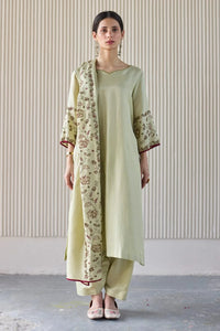 The Green Noori Suit by Sarang Kaur is an elegant, hand-embroidered ensemble crafted from premium Chandheri silk. Featuring a relaxed-fit kurta, matching pants, and a flowing dupatta, this three-piece set is perfect for the Spring/Summer season.